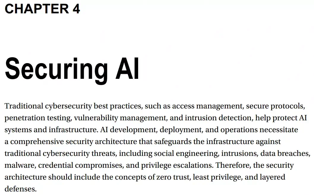 - گنجاندن رویکرد امنیت بر اساس طراحی در یکپارچهسازی هوش مصنوعی که بردارهای حمله مختص هوش مصنوعی را در نظر میگیرد و روشهای دفاعی سنتی و مختص هوش مصنوعی، مانند توسعه خصمانه (adversarial development)، نظارت بر رفتار مدل، تحلیل رانش داده (drift analysis)، اعتبارسنجی و فیلتر کردن ورودی، و فیلتر کردن خروجی را اعمال میکند.