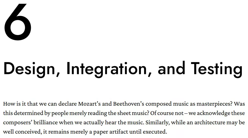 - فصل ۶، طراحی، یکپارچهسازی و آزمایش: یک مرور قوی از مراحل طراحی، استفاده از تاکتیکها و الگوهای نرمافزاری و ملاحظاتی در مورد چگونگی تأثیر معماری بر روی آزمایش (تست) ارائه میدهد.