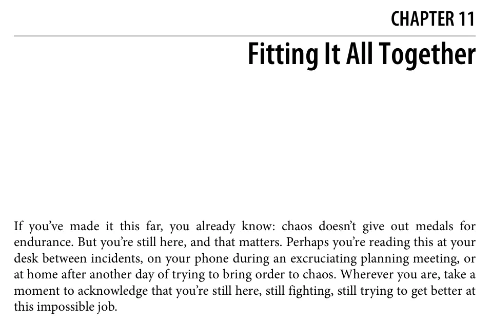 طی این سالها، رویکردها، استراتژیها و تکنیکهایی توسعه دادیم تا محیطهای آشفته را مدیریت کنیم و نتایج بهتری برای تیمها و سازمانهایمان به دست آوریم. ما این مشکلات را دقیقاً به یک شکل حل نمیکنیم و هر کدام حوزههای قوت و علایق خاص خودمان را داریم. بنابراین، بخش منظمی از تعاملاتمان شامل مقایسه یادداشتها در زمینههایی بود که در آنها ضعیفتر بودیم.