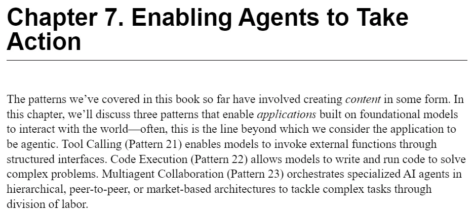 فصل ۷ در مورد ایجاد سیستمهای عاملیتمحور (Agentic) است، از جمله Tool Calling (الگوی ۲۱) و Multiagent Collaboration (الگوی ۲۳).