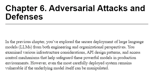 در فصل ۵ به چالشهای استقرار امن میپردازیم و بهترین شیوهها برای میزبانی مدل، طراحی API و کنترل دسترسی را بررسی میکنیم. یاد میگیرید چگونه LLMهای خود را از دسترسی غیرمجاز محافظت کنید و یکپارچگی خروجیهایشان را تضمین نمایید. هیچ بحثی دربارهٔ امنیت LLM بدون پرداختن به تهدید همیشگی حملات خصمانه کامل نیست.