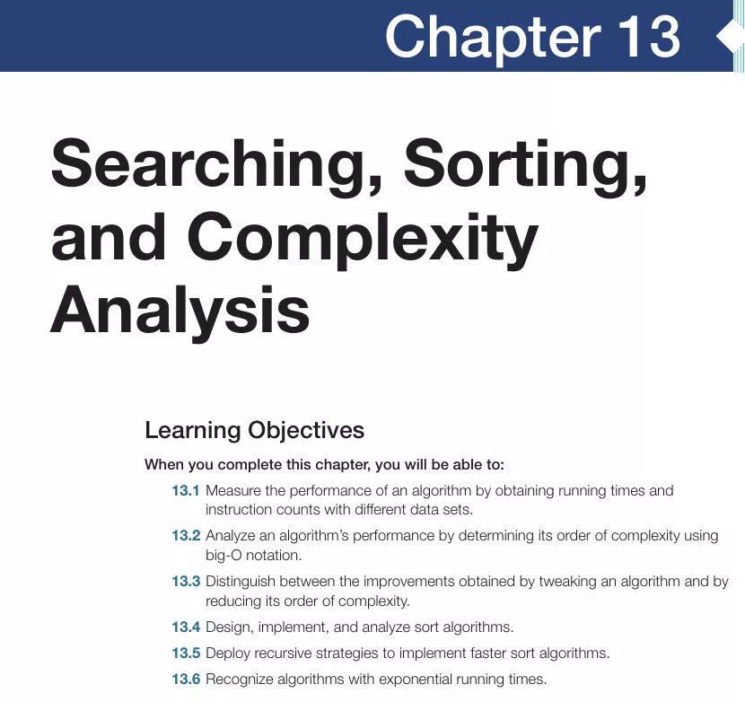 - Chapter 13: Searching, Sorting, and Complexity Analysis