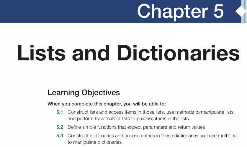 فصلهای ۴ و ۵ رشتهها، فایلهای متنی، لیستها و دیکشنریها را معرفی میکنند و فصل ۵ تعریف سادهٔ توابع را برای سازماندهی کد الگوریتمی میآورد. فصل ۶ انتزاع رویهای با توابع، طراحی از بالا به پایین و پالایش گامبهگام را بررسی میکند. فصل ۷ طراحی بازگشتی و برنامهنویسی تابعی با توابع مرتبه بالاتر را پوشش میدهد.