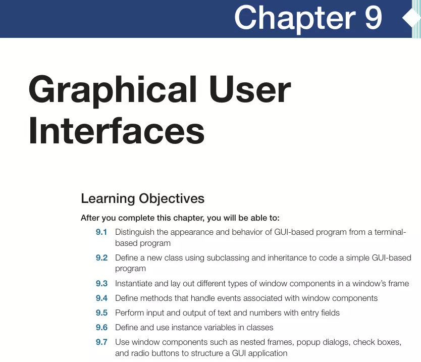 فصل ۸ استفاده از اشیاء و کلاسهای موجود، رابط برنامهنویسی کاربردی (API) کلاسها و کاربردهای گرافیک و پردازش تصویر را معرفی میکند. فصل ۹ تعریف کلاسهای جدید برای ساخت رابطهای کاربری گرافیکی (GUI)، مدل مبتنی بر رویداد در مقابل مدل مبتنی بر فرآیند، و الگوی مدل/نما را بررسی میکند. فصل ۱۰ ادامهٔ طراحی شیءگرا با تعریف کلاسهای کاملاً جدید و تأکید بر پلیمورفیسم است.